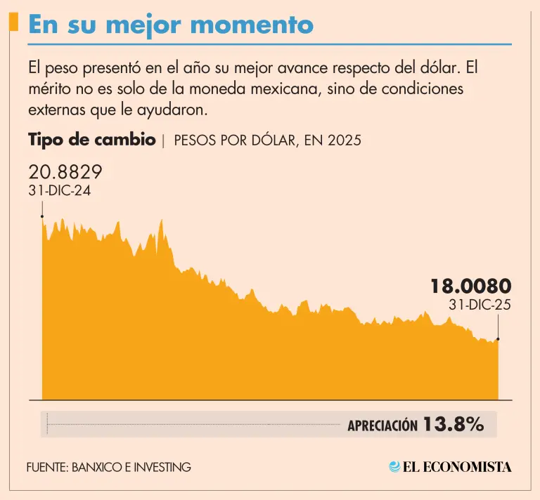 Gabriela Siller, directora de análisis de Banco Base, destacó que el peso cerró el 2025 en 18.008 unidades por dólar, siendo la mayor apreciación anual desde que se tiene registro, cuando la moneda se dejó al libre mercado.