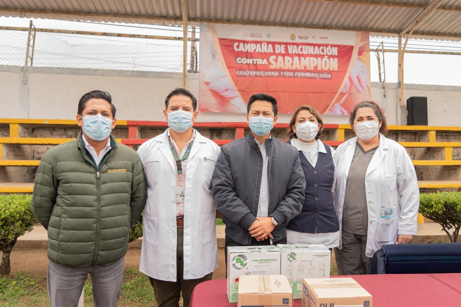 Acompañado por el doctor Jaime Lozano, coordinador regional del IMSS-Bienestar; la doctora Adriana Santos, directora del Centro de Salud de Coatepec; y Amelia Colorado, jefa de enfermeras, el alcalde dirigió un mensaje a la población: “Hoy me encuentro aquí en el Deportivo Adolfo López Mateos, llevando a cabo una campaña de vacunación en contra del sarampión y también de otras enfermedades, como es la influenza. Estamos invitando a toda la gente a que venga, que acuda”.